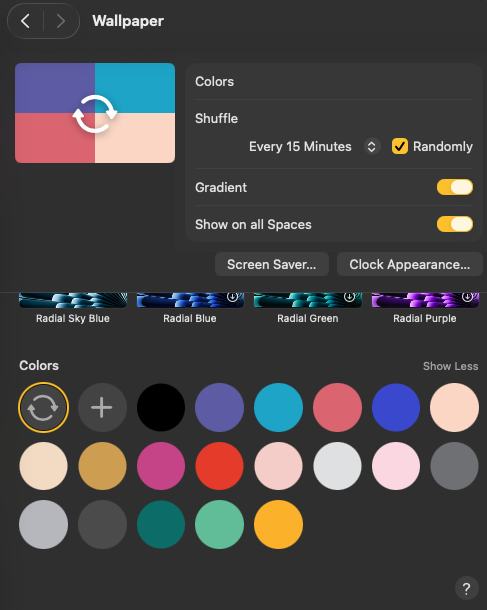I found my favorite feature of macOS. It’s the ‘Colors’ preset wallpaper that shuffles through colors on each desktop every X minutes. This is wonderful. Thank you. Only note - from time to time, maybe the ‘theme’ of the colors will also rotate? Or better yet, the preset colors one can choose from could be edited by the user, so colors can be added and removed depending on desired vibe.